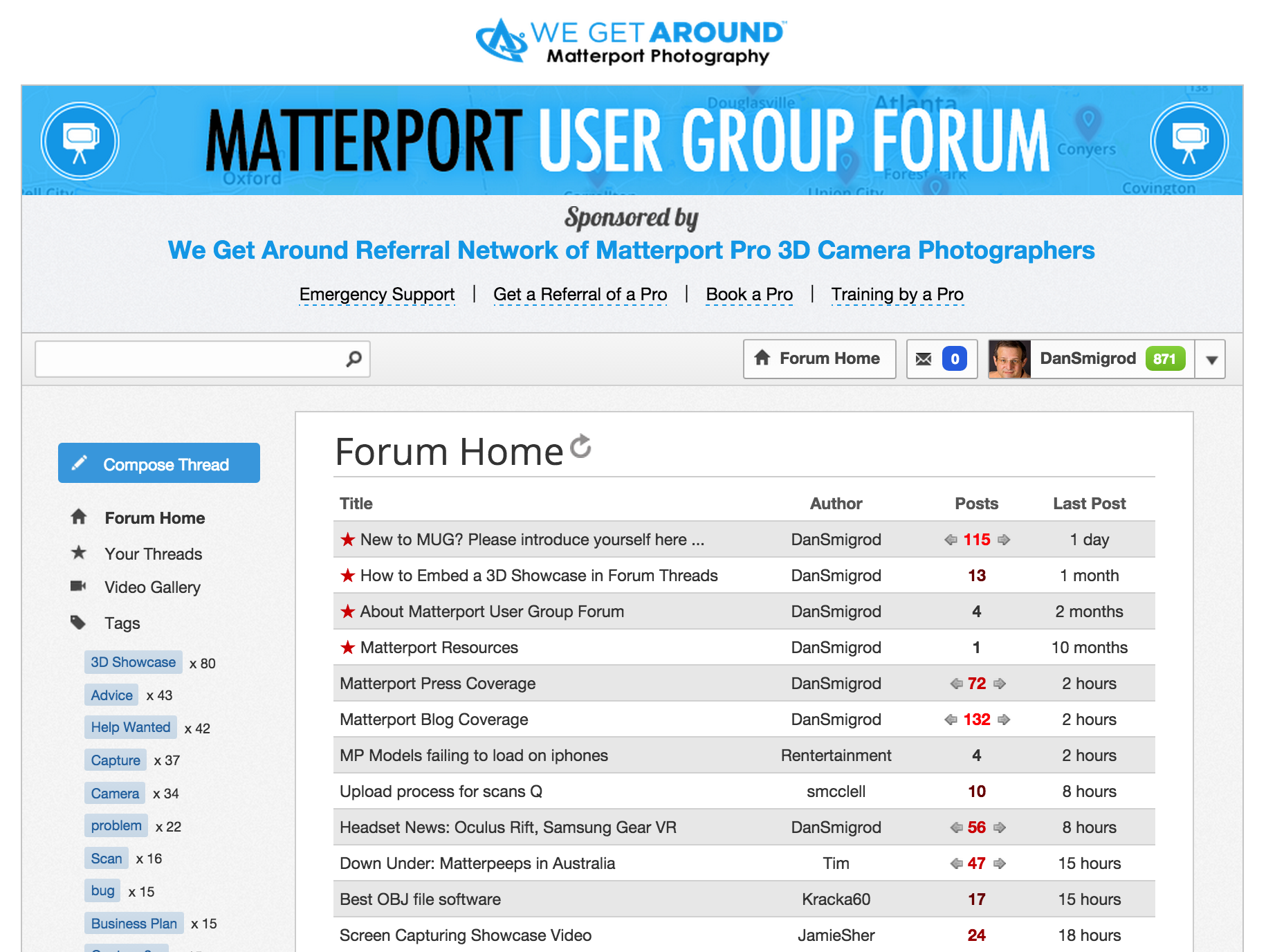 The free Forum was founded 26 August 2014 ago by We Get Around Chief Photographer Dan Smigrod to help create community around the Matterport 3D and VR Tour platform.