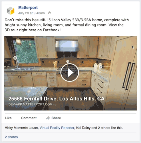 Social Sharing – With the integration of social sharing within Showcase 2.0, it will be easy and fast for Pro Photographers, Real Estate agents and viewers of the Showcases to share: including via Facebook, Twitter and email. The deep integration with Facebook is extra exciting because the Matterport 3D Showcase will launch from within a user's timeline: much as videos automatically play today within a Facebook newsfeed. (Let's hope Twitter lets Matterport leverage its Twitter Card solution for the same experience that does not require leaving Twitter to view the tour.)